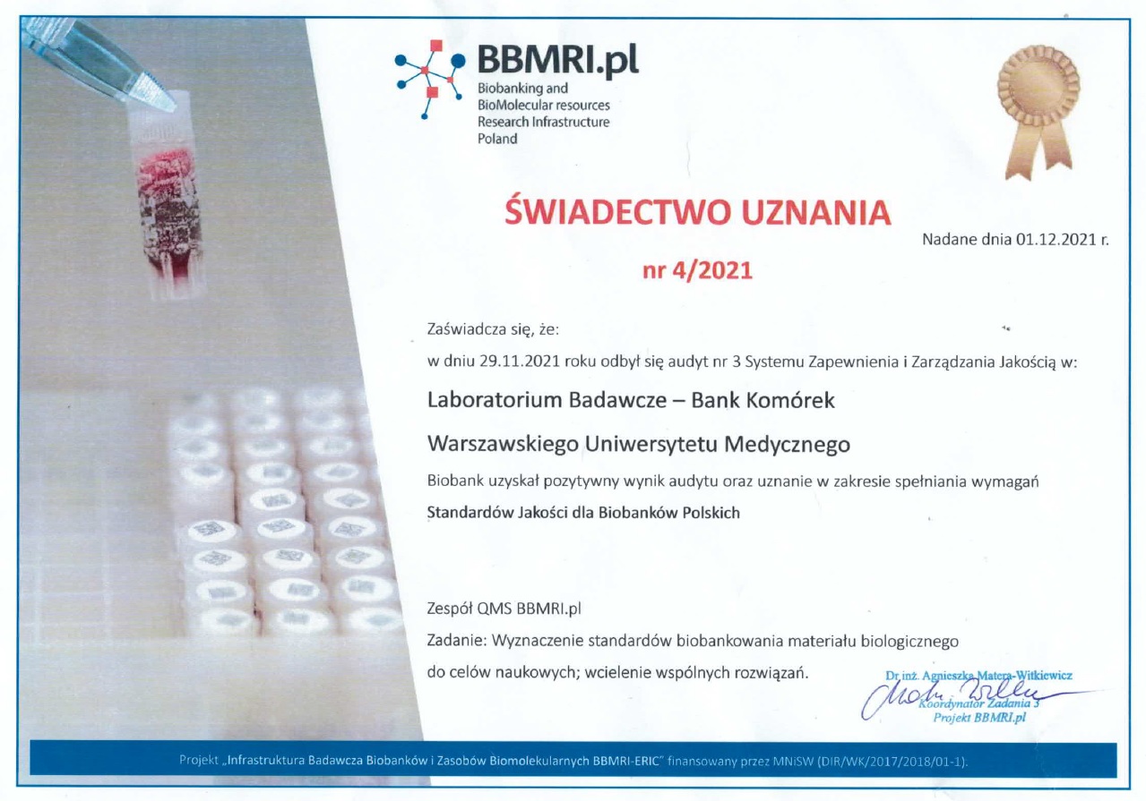 BBMRI.pl - Certyfikat z badań stężenia DNA 2020 BBMRI.pl - Certyfikat z badań czystości DNA 2021 BBMRI.pl - Certyfikat z badań stężenia DNA 2021 BBMRI.pl - Certyfikat z badań czystości DNA 2021 (parametr 260/230) BBMRI.pl - Świadectwo uznania